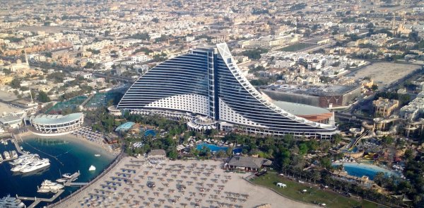 A világ első 7 csillagosnak kikiáltott, legtöbbet fényképezett hotelje a legendás Burj Al Arab szálloda, mely Dubai első számú látványossága. A vitorlát formázó hotel közvetlenül a Jumeirah Beach-en fekszik. A hotel az Emirátusok egyik legdrágább hotelje, mely a sejknek és népes családjának is kedvenc helye. A szálloda nevének jelentése az Arabok Tornya, mely 321 méteres magasságával az egyik legnagyobb szálloda a világon. Egy mesterséges szigeten található, 280 méterre a parttól, amellyel saját híd köti össze. A legfelső emelet szintjén elhelyezett leszállópályára helikopterrel is landolhatnak a vendégek, és itt található a világ legmagasabban épült teniszpályája is, ami a kör alakú teraszra épült.